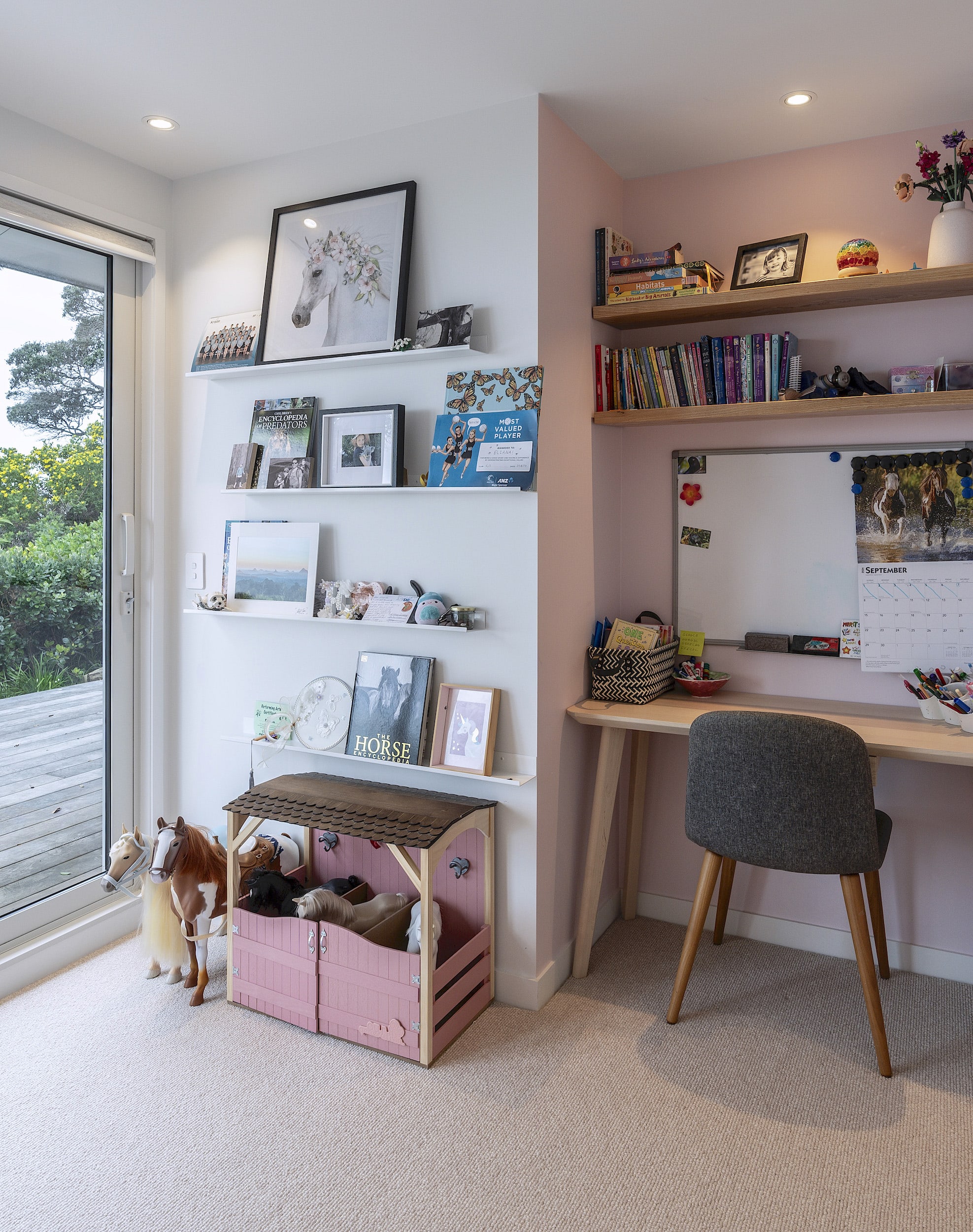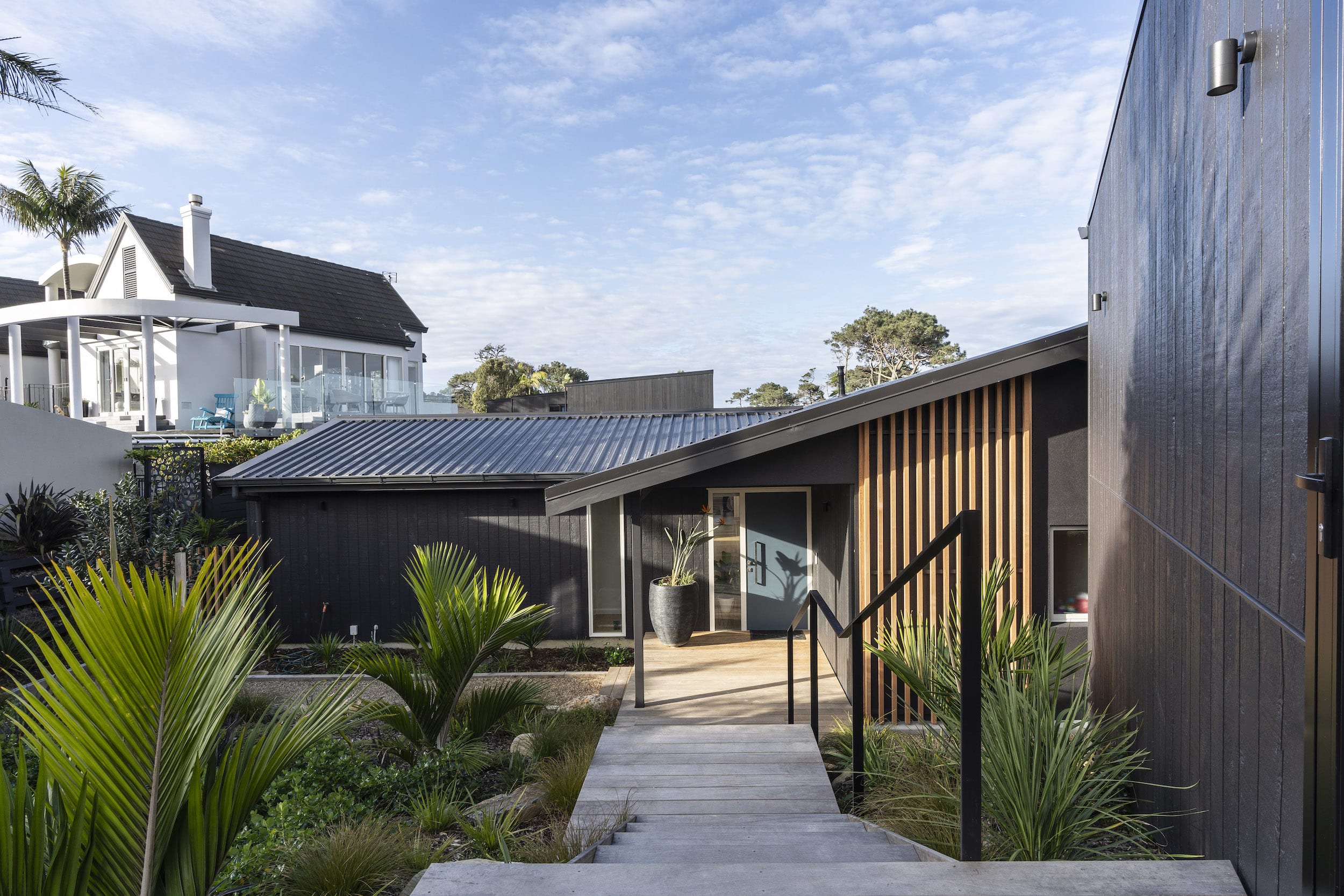 It meanders through a freshly planted front garden of palms and cabbage trees to the front door – a true journey of welcome.