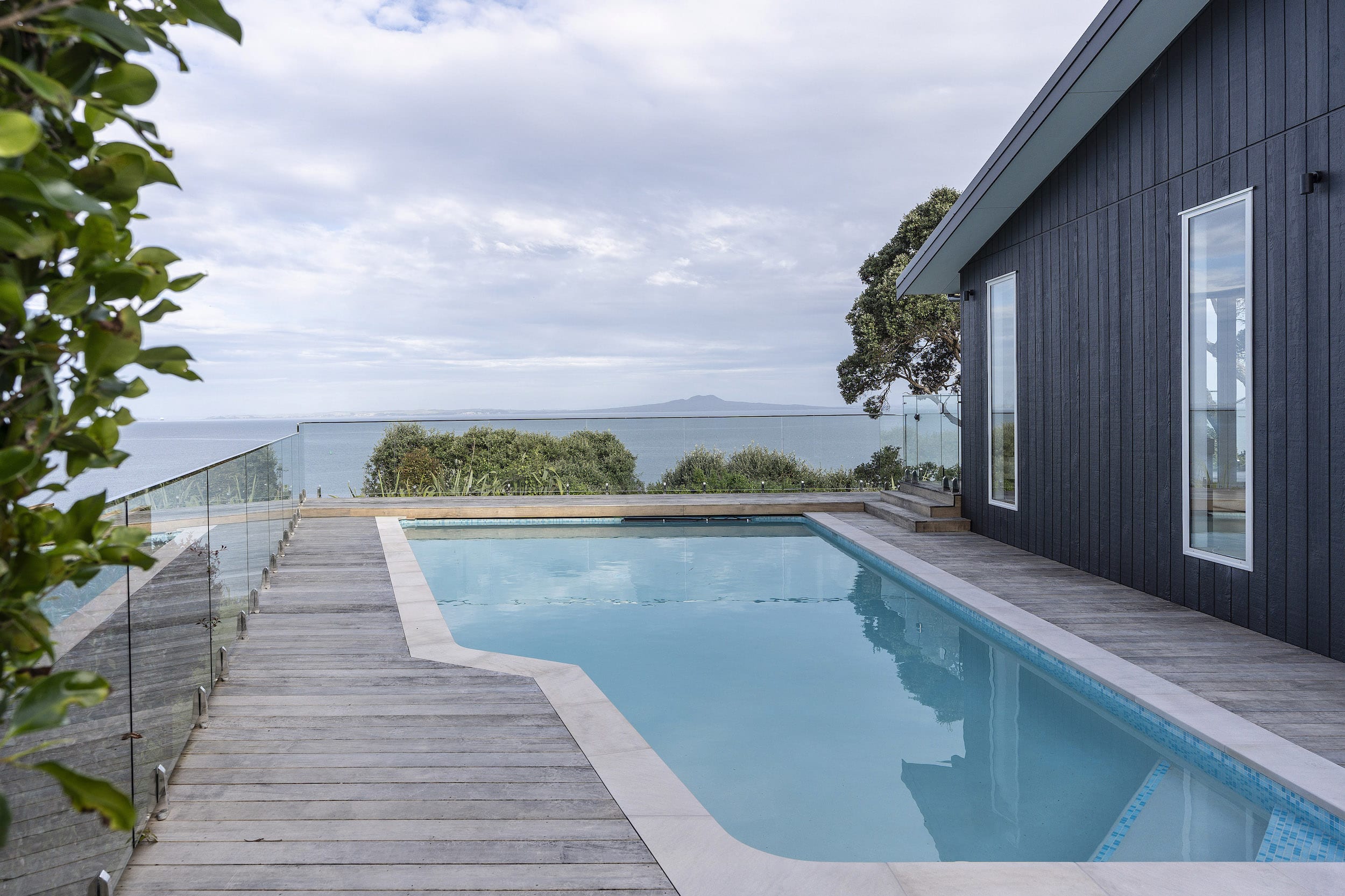 Rounded orange coping tiles from the ‘90s have been replaced with white sandstone tiles and new decking to better match the new-look exterior.