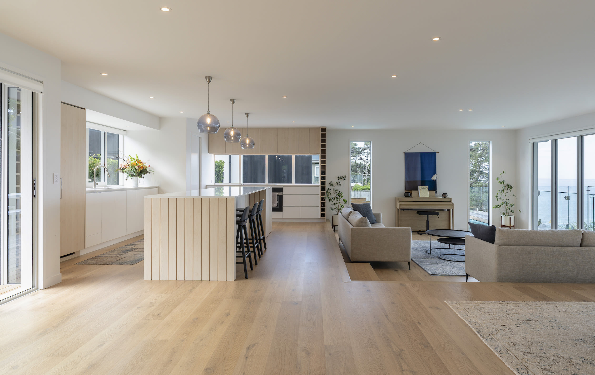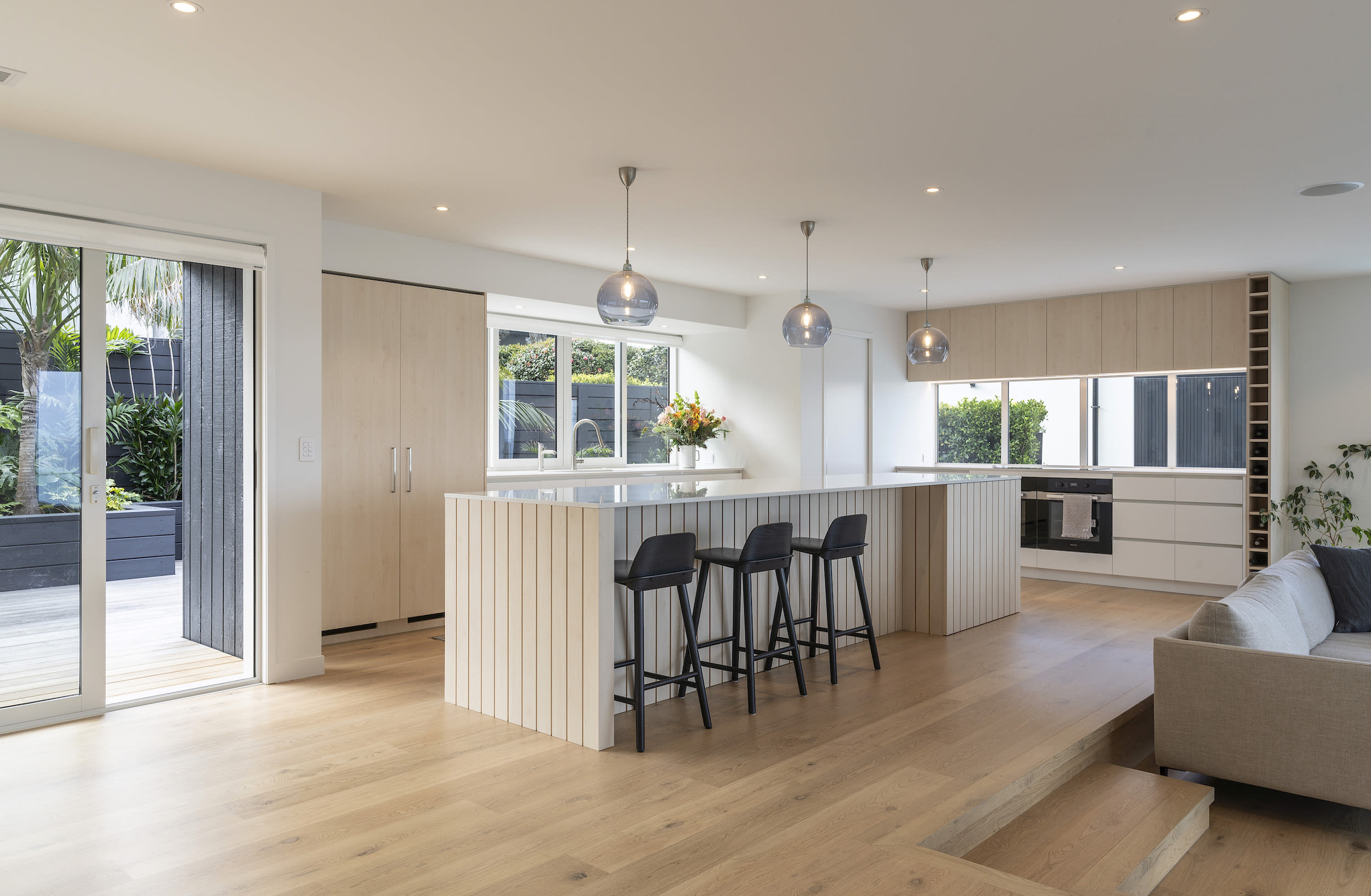 Pale timber floors team with light-wood cabinetry in the kitchen and hand-blown European glass pendants hanging over the large bench keep the mood relaxed and casual.