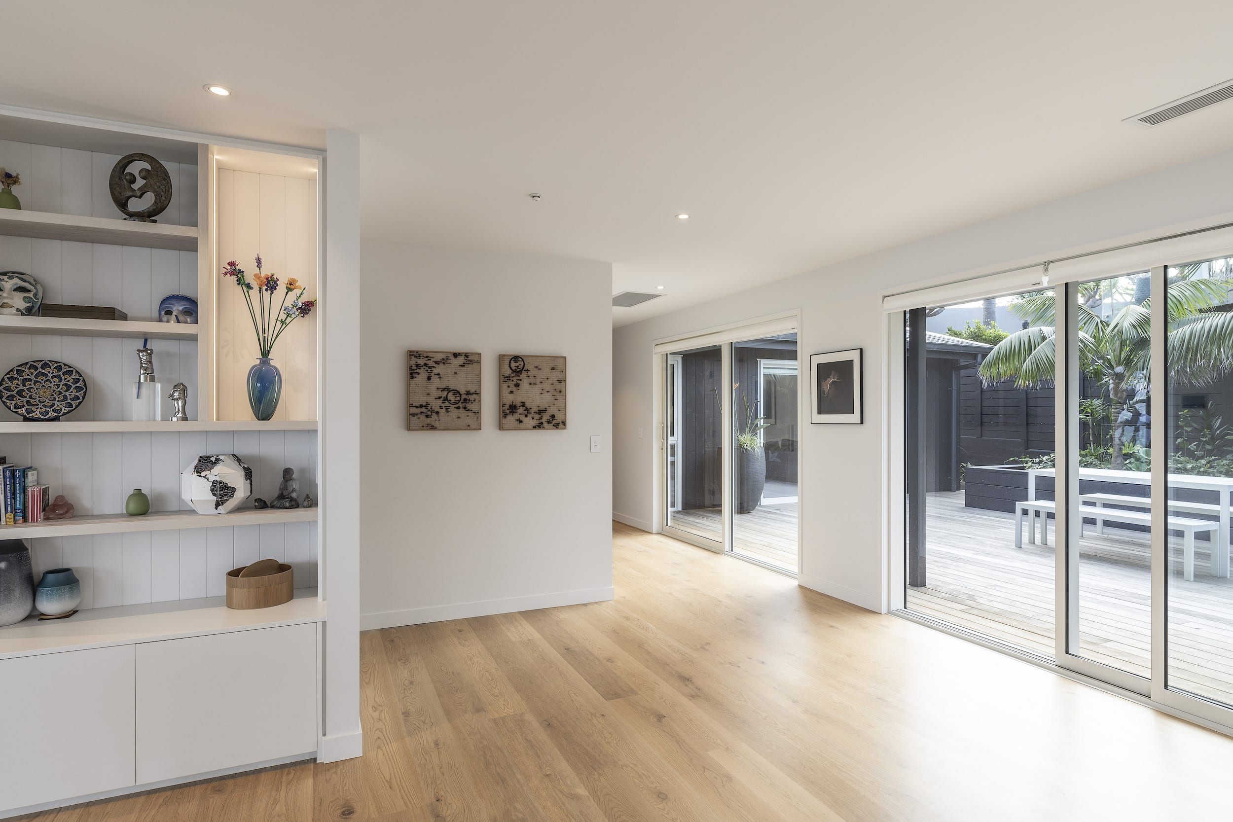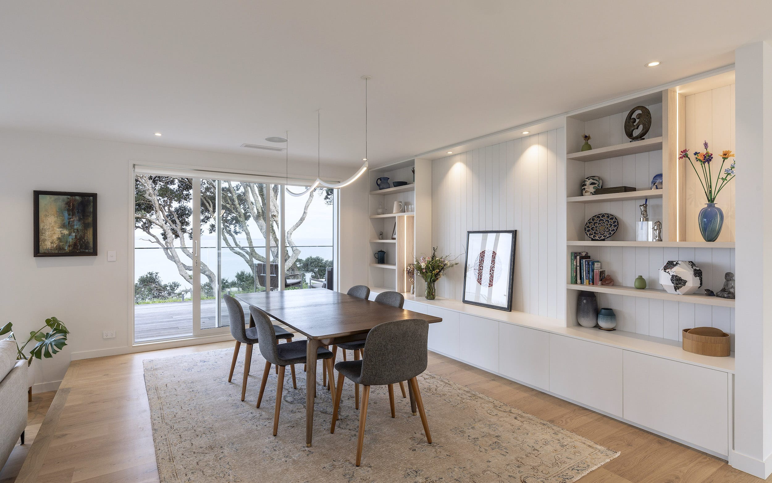 Removing walls has crafted a vast open-plan living space where the dining room is backed by a wall of built-in display shelving and overlooks a sunken lounge with a bank of floor-to-ceiling sliders that access the sea view.