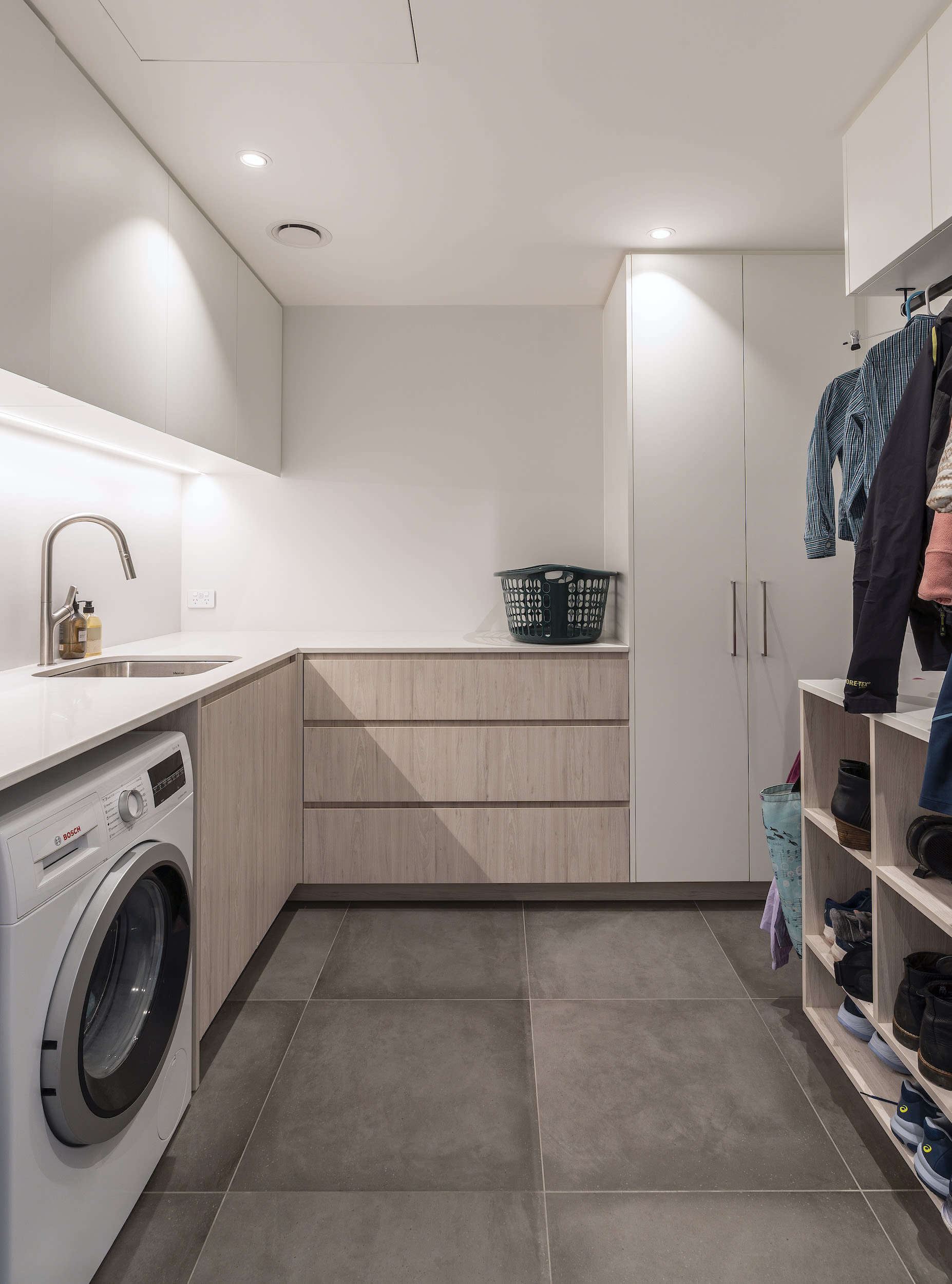 The hallway was dark and awkwardly angled; there was no laundry or pantry and no guest space and they imagined remodelling the single garage into a suite for overseas visitors.